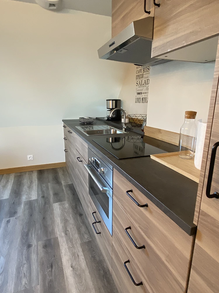 Toutes nos cuisines sont équipées : plaques induction, lave-vaisselle, four micro-ondes combiné multifonctions, cafetière, bouilloire, frigo-congélateur, vaisselle). L’épicerie de base : huile, vinaigre, café, thé, sucre, sel et poivre et les consommables sont là pour débuter votre séjour sereinement.