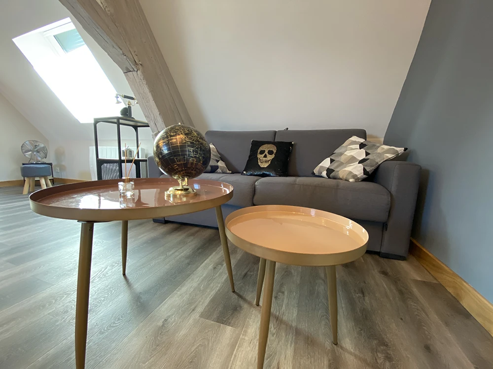 - un séjour cuisine avec un canapé lit confortable de 140,